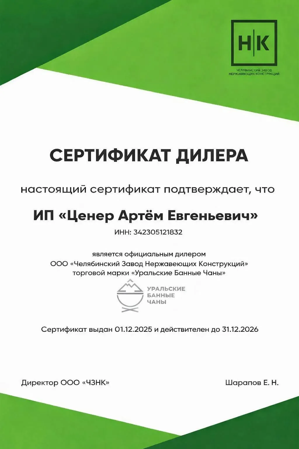ОФИЦИАЛЬНЫЙ ДИЛЕР ЧЕЛЯБИНСКОГО ЗАВОДА НЕРЖАВЕЮЩЕЙ КОНСТРУКЦИЙ (ООО ЧЗНК): ИП Ценер Артём Евгеньевич